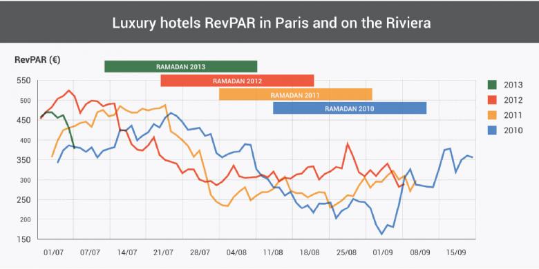 Kinerja revenue per available room (RevPAR) hotel-hotel mewah di Paris dan French Riviera.